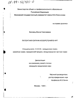 Структура диссертации. В работе раскрываются три основные составляющие патентных отношений: субъект, объект и права, вытекающие из обладания патентом. Этому соответствует и структура диссертации, в отдельных главах которой, наряду с указанием главных проблем, освещается и ряд других, возникающих при этом теоретических и практических вопросов. Работа состоит из введения, четырех глав и списка использованной литературы. Главы называются «Понятие и содержание патентной охраны в ФРГ», «Условия патентоспособности изобретения в ФРГ», «Оформление права на патент в ФРГ» и «Патент как форма охраны изобретения».