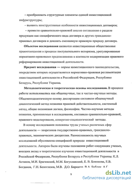 В основу исследования положены труды ученых различных сфер деятельности — теоретиков государственно-правовых, гражданско-правовых, экономических дисциплин. Разноплановость научных исследований обусловлена спецификой природы инвестиционной деятельности. Автором были изучены положения работ следующих ученых, внесших вклад в теоретическое изучение инвестиционной деятельности в Российской Федерации, Республике Беларусь и Республике Украина: К.Л. Астапов, М.И. Брагинский, М.М. Богуславский, Е. В. Блинкова, Е.В. Богданов, Г.Н. Белоглазов, М.В. Д.О. Бирюков, В.А. Бублик, А.Г.