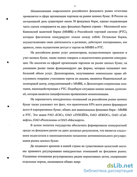 Одной из многих причин, порождающих указанные проблемы российского рынка ценных бумаг, является недостаточное развитие конкурентных отношений на фондовом рынке. Отсутствие комплексных мер по поддержке конкуренции, в том числе правового характера, ведет к монополизации фондового рынка, что снижает эффективность его функционирования, и, как следствие, эффективность экономической системы в целом.