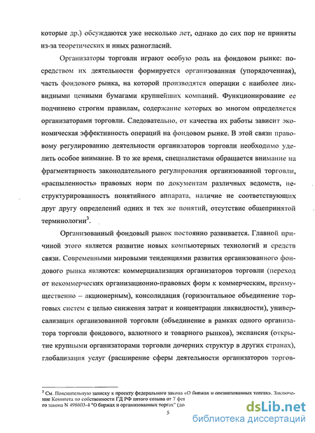 Организаторы торговли играют особую роль на фондовом рынке: посредством их деятельности формируется организованная (упорядоченная), часть фондового рынка, на которой производятся операции с наиболее ликвидными ценными бумагами крупнейших компаний. Функционирование ее подчинено строгим правилам, содержание которых во многом определяется организаторами торговли. Следовательно, от качества их работы зависит экономическая эффективность операций на фондовом рынке. В этой связи правовому регулированию деятельности организаторов торговли необходимо уделить особое внимание. В то же время, специалистами обращается внимание на фрагментарность законодательного регулирования организованной торговли, «распыленность» правовых норм по документам различных ведомств, не-структурированность понятийного аппарата, наличие не соответствующих друг другу определений одних и тех же понятий, отсутствие общепринятой терминологии3.