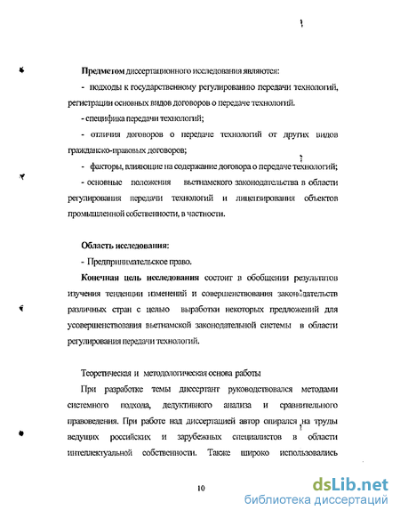 проведение на основе изучения законодательств зарубежных стран сравнительного анализа систем, правового регулирования передачи технологий; исследование основных форм передачи технологий во Вьетнаме, а именно: договора уступки патента, лицензионного договора, договора франчайзинга (договора коммерческой концессии) и оглашений о передаче ноу-хау;