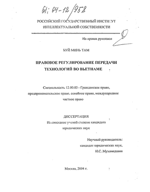 При выборе темы мы исходили га того, что во вьетнамской литературе по праву промышленной собственности отсутствуют специальные комплексные исследования проблемы правового регулирования передачи технологий на государственном уровне.