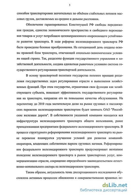 Обеспечение гарантированных Конституцией РФ свободы передвижения граждан, единства экономического пространства и свободного перемещения товаров и услуг потребовало целенаправленного опережающего устойчивого развития транспорта. В ходе реформы железнодорожного транспорта РФ были проведены базовые преобразования. На сегодняшний день созданы основы правовой базы транспорта, отвечающей социально-экономическим условиям нашей страны. Так, разделены функции государственного управления и хозяйственной деятельности, создана адекватная рыночным условиям система государственного регулирования транспортной деятельности.