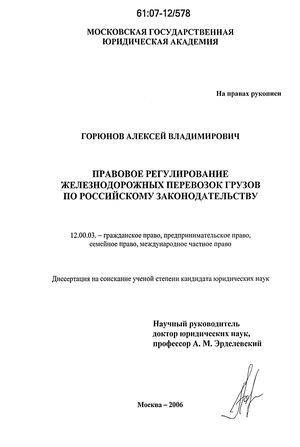 Предмет диссертационного исследования составляют нормы российского законодательства, регулирующие отношения по перевозке грузов железнодорожным транспортом, судебная и арбитражная практика, а также доктри-нальное толкование норм права, научные труды, посвященные проблемам гра-