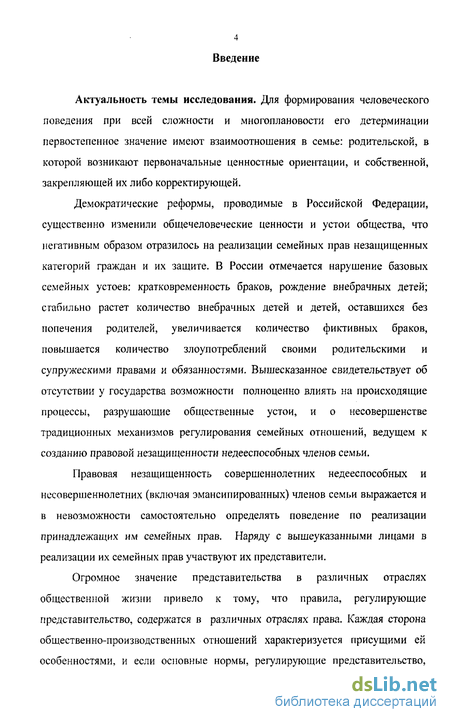 Актуальность исследования вызвана и внутренними потребностями развития семейного права. В связи с принятием Семейного Кодекса РФ 1995 года активизировались исследования в науке семейного права по многим теоретическим и практическим проблемам. Одним из важных положений, слабо разработанных в науке семейного права, является вопрос представительства в семейных отношениях.