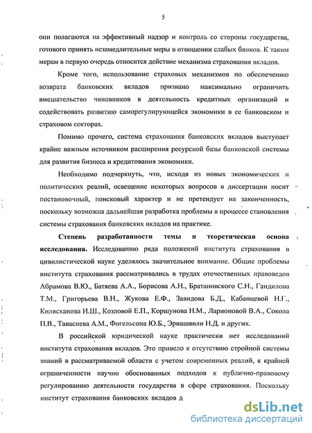 В российской юридической науке практически нет исследований института страхования вкладов. Это привело к отсутствию стройной системы знаний в рассматриваемой области с учетом современных реалий, к крайней ограниченности научно обоснованных подходов к публично-правовому регулированию деятельности государства в сфере страхования. Поскольку институт страхования банковских вкладов для отечественной науки является