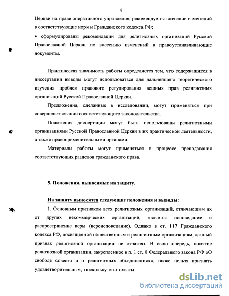 Положения диссертации могут быть использованы религиозными организациями Русской Православной Церкви в их практической деятельности, а также правоприменительными органами.