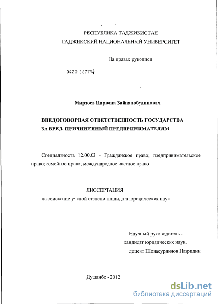 В современной же юридической науке Республики Таджикистан отсутствуют какие–либо серьёзные и весомые научные труды, посвященные ответственности государства за вред, причинений предпринимателям, в частности его внедоговорной ответственности. Справедливости ради следует отметить, что проблемам, связанным с ответственностью государства за вред, причиненный предпринимателям, посвящены лишь небольшие по объему параграфы учебников по предпринимательскому и гражданскому праву, разделы комментария к Гражданскому кодексу РТ и одна научная статья д.ю.н., профессора М.З.Рахимова: «Имущественная ответственность государства за причиненный предпринимателям вред».