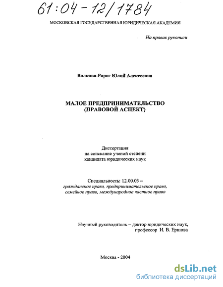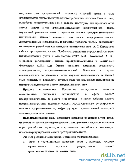 актуальна для представителей различных отраслей права в силу комплексности самого института малого предпринимательства Вместе с тем, выработка концептуальных основ данного института, как представляется автору, задача науки предпринимательского (хозяйственного) права, изучающей различные аспекты правового режима предпринимательской деятельности. Следует отметить, что малое предпринимательство диссертационных исследований. В качестве примеров назовем диссертации на соискание ученой степени кандидата юридических наук А. Г. Коршунова «Малое предпринимательство. Проблемы применения упрощенной системы налогообложения, учета и отчетности» (2002 год), Пахолковой А. Ю. «Правовое регулирование малого предпринимательства в Российской Федерации» (2002 год). Однако динамика изменений российского законодательства, социально-экономической обстановки в стране предопределяют потребность в новых научных исследованиях по данной теме, опираясь на результаты которых стало бы возможным формирование нового законодательства о малом предпринимательстве.
