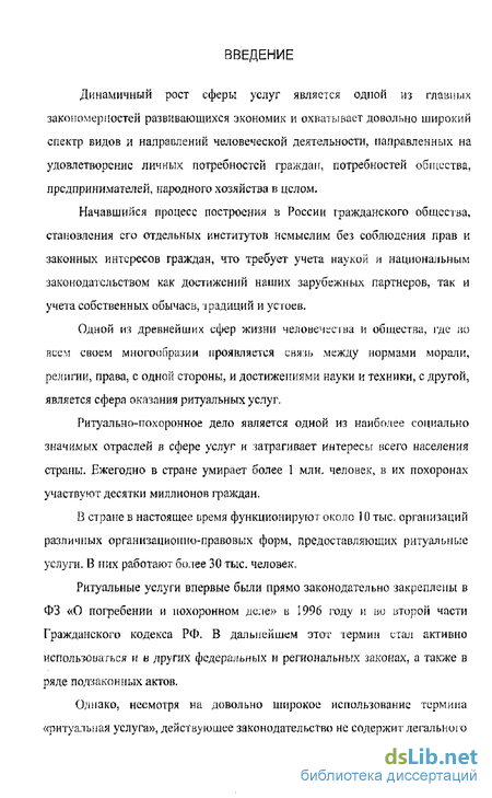 Одной из древнейших сфер жизни человечна на и общества, где но всем своем многообразии проявляется связь между нормами морали, религии, права, с одной стороны, и достижениями науки и техники, с другой, является сфера оказания ритуальных услуг.