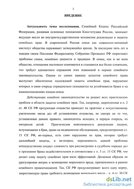 В настоящее время вопросы правовой защиты семейных прав в Российской Федерации актуальны как никогда. Сегодня становится очевидным тот факт, что укрепление российской государственности в определенной степени зависит от поддержки и защиты семьи, воспитания чувства ответственности родителей за своих детей. Не случайно постоянно в Посланиях Президента РФ Федеральному Собранию особое внимание уделяется данным проблемам .