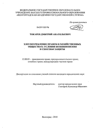 Апробация результатов исследования. Материалы диссертационного исследования используются для обеспечения интересов участников хозяйственных обществ и для защиты от злоупотребления правом в хозяйственных обществах, осуществляющих свою деятельность в Волгограде, Воронеже, Новороссийске. Основные положения диссертации используются автором в учебном процессе при проведении занятий по учебным дисциплинам: «Коммерческое право», «Предпринимательское право», «Хозяйственное право» в ФГОУ ВПО «Волгоградский государственный архитектурно-строительный университет» с 2005 г. по настоящее время.