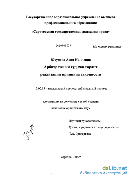 Апробация результатов исследования. Диссертация выполнена и обсуждена на кафедре арбитражного процесса ГОУ ВПО «Саратовская государственная академия права».