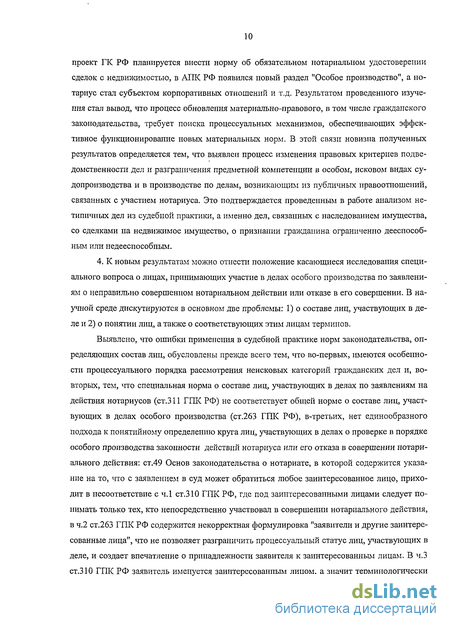 В диссертации это аргументируется тем, что в ГПК РФ были включены новые категории дел с участием нотариуса, в Основах законодательства РФ о нотариате закреплены новые виды нотариальных действий, в ГК РФ изменилось правовое регулирование наследственных отношений, претерпело изменения законодательство о собственности, в новый проект ГК РФ планируется внести норму об обязательном нотариальном удостоверении сделок с недвижимостью, в АПК РФ появился новый раздел "Особое производство", а нотариус стал субъектом корпоративных отношений и т.д. Результатом проведенного изучения стал вывод, что процесс обновления материально-правового, в том числе гражданского законодательства, требует поиска процессуальных механизмов, обеспечивающих эффективное функционирование новых материальных норм. В этой связи новизна полученных результатов определяется тем, что выявлен процесс изменения правовых критериев подведомственности дел и разграничения предметной компетенции в особом, исковом видах судопроизводства и в производстве по делам, возникающим из публичных правоотношений, связанных с участием нотариуса. Это подтверждается проведенным в работе анализом нетипичных дел из судебной практики, а именно дел, связанных с наследованием имущества, со сделками на недвижимое имущество, о признании гражданина ограниченно дееспособным или недееспособным. Положение о допускаемом в известных пределах переходе от одного вида производства к другому, который должен учитываться при рассмотрении в суде дел по заявлениям на неправильно совершенные нотариальные действия, также выносится на защиту.