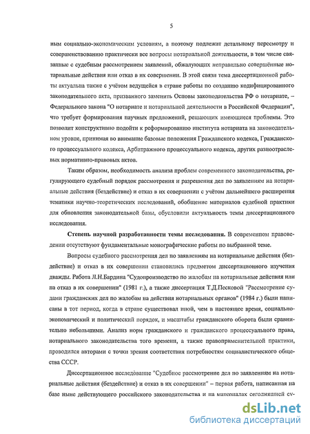 Таким образом, необходимость анализа проблем современного законодательства, регулирующего судебный порядок рассмотрения и разрешения дел по заявлениям на нотариальные действия (бездействие) и отказ в их совершении с учётом дальнейшего расширения тематики научно-теоретических исследований, обобщение материалов судебной практики для обновления законодательной базы, обусловили актуальность темы диссертационного исследования.