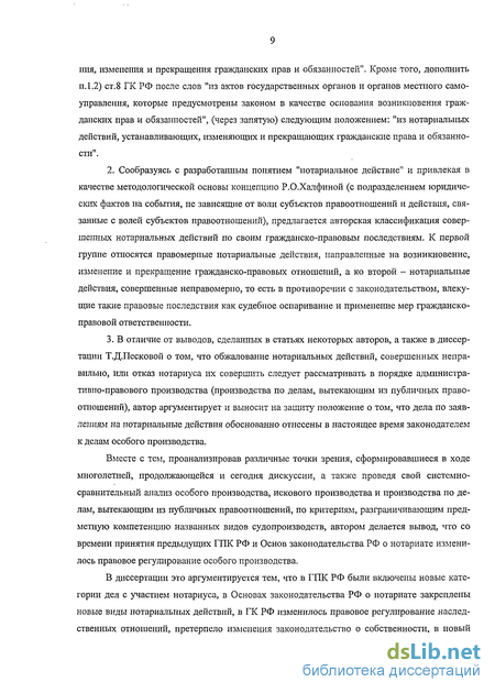 3. В отличие от выводов, сделанных в статьях некоторых авторов, а также в диссертации Т.Д.Песковой о том, что обжалование нотариальных действий, совершенных неправильно, или отказ нотариуса их совершить следует рассматривать в порядке административно-правового производства (производства по делам, вытекающим из публичных правоотношений), автор аргументирует и выносит на защиту положение о том, что дела по заявлениям на нотариальные действия обоснованно отнесены в настоящее время законодателем к делам особого производства.