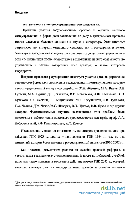 Вопросы правового регулирования института участия органов управления в процессе в форме дачи заключения исследовались многими учеными, которые внесли существенный вклад в его разработку (С.Н. Абрамов, М.А. Викут, Р.Е. Гукасян, М.А. Гурвич, Д.Р. Джалилов, И.И. Ильинская, А.Ф. Клейнман, В.Ю. Кулакова, Г.Л. Осокина, Г. Рындзюнский, М.К. Треушников, Л.В. Туманова, Н.А. Чечина, Д.М. Чечот, М.С. Шакарян, В.Н. Щеглов, В.В. Ярков и ряд других авторов). Фундаментальные научные исследования этих проблем были проведены в работах таких известных процессуалистов как проф. проф. А.А. Добровольский, Р.Ф. Каллистратова, А.Ф. Козлов.