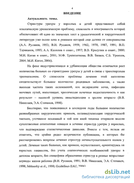Стриктуры уретры у взрослых и детей представляют собой классическую урологическую проблему, сложность и многранность которой обеспечивают ей одно из значимых мест в урологической и хирургической литературе уже около века и решение которой еще далеко от совершенства (А.А. Русанов, 1953; В.И. Русаков, 1959, 1962, 1970, 1987, 1991; В.П. Тараканов, 1985; А.А. Камалов и соавт., 1997; В.В. Красулин и соавт., 2000; М.И. Коган и соавт., 2001; М.Ф. Трапезникова, В.В. Базаев, СБ. Уренков, 2004; М.И. Коган, 2006).