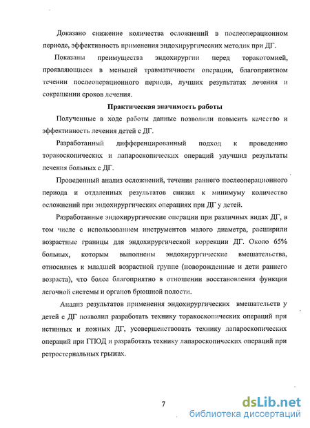 Анализ результатов применения эндохирургических вмешательств у детей с ДГ позволил разработать технику торакоскопических операций при истинных и ложных ДГ, усовершенствовать технику лапароскопических операций при ГПОД и разработать технику лапароскопических операций при ретростернальных грыжах.