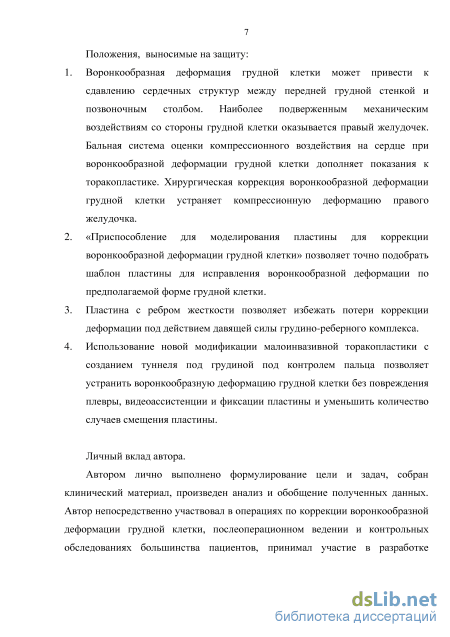 Основываясь на собственном опыте, в клинике модифицирована малоинвазивная торакопластика по методу D. Nuss, а также разработана корригирующуя пластина для стабилизации грудино-реберного комплекса с более высокой степенью жесткости. В корригирующей пластине выполнено углубление на 0,3-0,5 см, образующее с обратной стороны ребро жесткости (патент РФ № 112617).