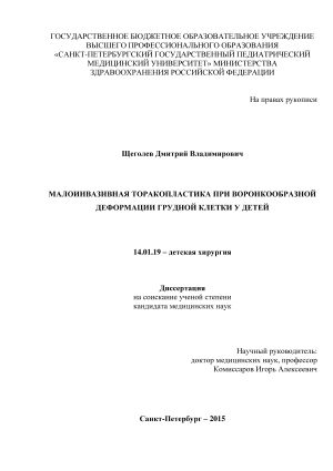 Мы выделили 2 группы показаний к торакопластике при ВДГК: 1) косметические и психологические, 2) функциональные нарушения со стороны сердечно-сосудистой и дыхательной систем. Косметические показания имелись у всех пациентов. Чем тяжелее деформация, тем в более раннем возрасте возникали показания к ее хирургической коррекции. Для индивидуального подбора пластины изобретено «Приспособление для моделирования пластины для коррекции воронкообразной деформации грудной клетки» (патент РФ № 111745). 29 пациентам (21,6%) выполнена малоинвазивная торакопластика по оригинальному методу D. Nuss. Средняя продолжительность операции составила 70,8 ± 14,5 минут. Осложнениями операции были подкожная эмфизема, воспаление раны, смещение пластины. У всех пациентов, оперированных по оригинальному методу D. Nuss, отмечалось интраоперационное повреждение париетальной плевры с 2 сторон. В конце операции всем выполнено дренирование плевральных полостей. У 2 больных развилась подкожная эмфизема. Это осложнение мы связываем с нарушением функции дренажной системы. В раннем послеоперационном периоде у 3 больных произошла миграция пластины, что послужило основанием к повторной торакопластике с заменой металлоконструкции. Поверхностное инфицирование послеоперационных ран отмечено в 2 случаях. Отдаленные результаты торакопластики по D. Nuss были хорошими в 22 случаях, удовлетворительными – в 4 и неудовлетворительными – в 3.