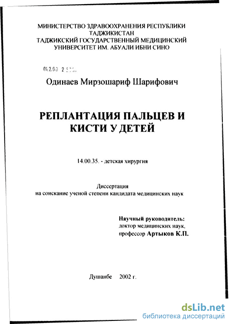 Одинаев Мирзошариф Шарифович. Реплантация пальцев и кисти у детей : диссертация ... кандидата медицинских наук : 14.00.35 / Одинаев Мирзошариф Шарифович; [Место защиты: Таджикский государственный медицинский университет].- Душанбе, 2002.- 98 с.: ил.