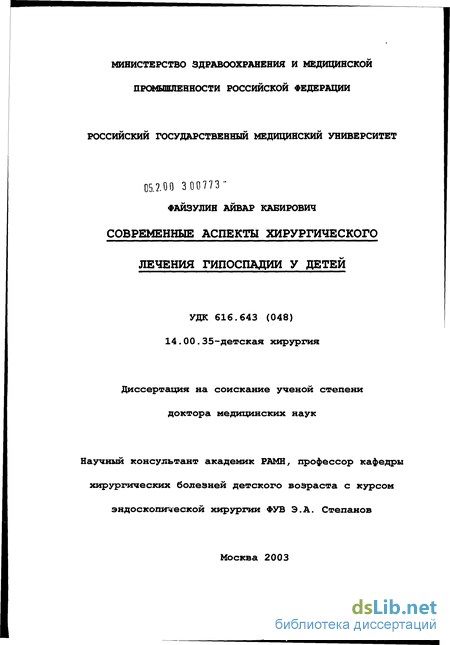 Внедрение результатов в практику. С 1990 г. одноэтапные методы оперативного лечения гипоспадии у детей в возрасте от 7 месяцев до 15 лет внедрены в практику отделения плановой хирургии и урологии ДКБ 13 им. Н.Ф.Филатова, отделения урологии ДРБ г. Москвы, НИИ педиатрии РАМН и ДРБ г. Йошкар-Олы, ДГКБ №38 г. Москвы, ДГКБ №3 г. Москвы, ДГКБ №2 им. Св. Владимира г. Москвы и отделения детской хирургии ДГБ г. Новомосковск.