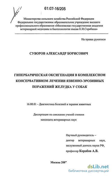 Эффективность применения гипербарической оксигенации в комплексном лечении язвенно-эрозивных поражений желудка у собак в условиях клиники.