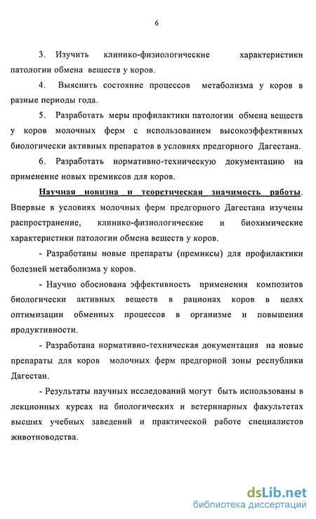Научная новизна и теоретическая значимость работы. Впервые в условиях молочных ферм предгорного Дагестана изучены распространение, клинико-физиологические и биохимические характеристики патологии обмена веществ у коров.