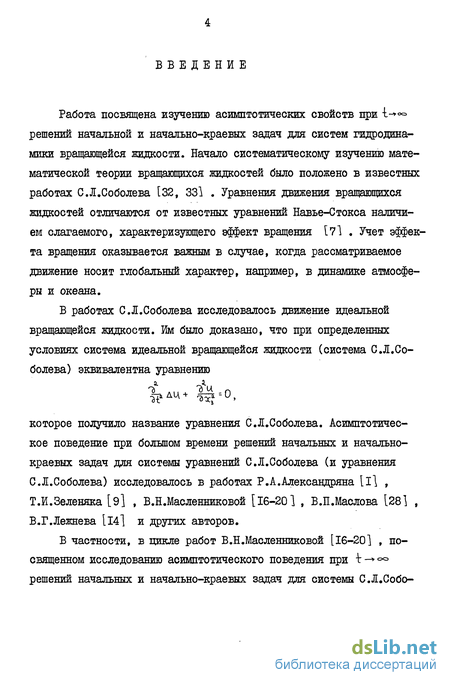 В работах С.Л.Соболева исследовалось движение идеальной вращающейся жидкости. Ш было доказано, что при определенных условиях система идеальной вращающейся жидкости (система С.Л.Соболева) эквивалентна уравнению которое получило название уравнения С.Л.Соболева. Асимптотическое поведение при большом времени решений начальных и начально-краевых задач для системы уравнений С.Л.Соболева (и уравнения С.Л.Соболева) исследовалось в работах Р.А.Александряна [I] , Т.И.Зеленяка [9] , В.Н.Масленниковой [16-20] , В.П.Маслова [28] , В.Г.Лежнева [14] и других авторов.