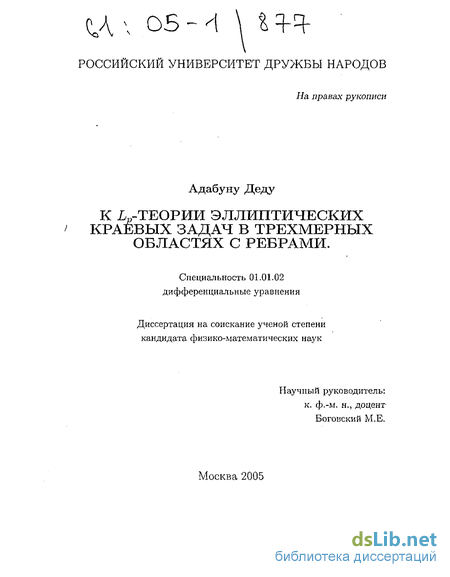 В этой работе решаются вопросы существования и несуществования, единственности и неединственности обобщенных решений задач Дирихле и Неймана в Соболевском классе L*, т.е с первыми производными из Lp, для уравнения Пуассона в ограниченных и неограниченных трехмерных областях с ребрами — в частности, в двугранном угле fi = Га х 1, где Га — плоский угол с раствором а (0,2л"]. Рассматриваемая обобщенная постановка как задачи Дирихле, так и задачи Неймана эквивалентна разложению пространства Лебега Lp(Q;R3) вектор-функций v : 1 —ї М3 в прямую сумму соответствующих замкнутых подпространств соленоидальных и потенциальных вектор-функций. Тема диссертации является непосредственным продолжением исследований, начатых автором в выпускной работе и в магистерской диссертации.