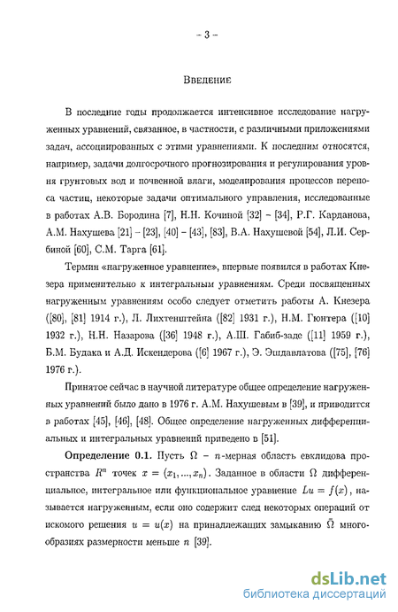 Термин «нагруженное уравнение», впервые появился в работах Кнезера применительно к интегральным уравнениям. Среди посвященных нагруженным уравнениям особо следует отметить работы А. Кнезера ([80], [81] 1914 г.), Л. Лихтенштейна ([82] 1931 г.), Н.М. Гюнтера ([10] 1932 г.), Н.Н. Назарова ([36] 1948 г.), А.Ш. Габиб-заде ([11] 1959 г.), Б.М. Будака и А.Д, Искендерова ([6] 1967 г.), Э. Эшдавлатова ([75], [76] 1976 г.).