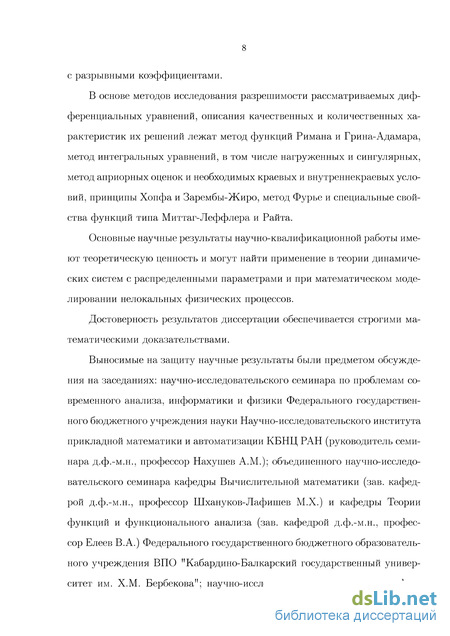 Апробация работы. Выносимые на защиту научные результаты были предметом обсуждения на заседаниях: научно-исследовательского семинара по проблемам современного анализа, информатики и физики Федерального государственного бюджетного учреждения науки Научно-исследовательского института прикладной математики и автоматизации КБНЦ РАН (руководитель семинара д.ф.-м.н., профессор Нахушев A.M.); объединенного научно-исследовательского семинара кафедры Вычислительной математики (зав. кафедрой д.ф.-м.н., профессор Шхануков-Лафишев М.Х.) и кафедры Теории функций и функционального анализа (зав. кафедрой д.ф.-м.н., профессор Елеев В.А.) Федерального государственного бюджетного образовательного учреждения ВПО "Кабардино-Балкарский государственный университет им. Х.М. Бербекова"; научно-исследовательского семинара кафедры Функционального анализа и его применения (руководитель семинара академик РАН Моисеев Е.И.) факультета Вычислительной математики и кибернетики Федерального государственного образовательного учреждения ВПО "Московский государственный университет им. М.В. Ломоносова"; научно-исследовательского семинара кафедры Диффе-