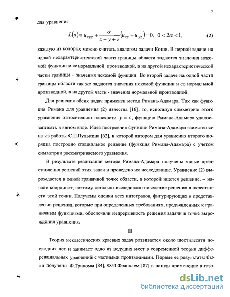 Римана-Адамара, метод общих и специальных решений и другие. В 1990 году В.И.Жегалов в работе [34] ввел понятие функции Римана для уравнения с достаточно гладкими коэффициентами, доказал факт ее существования и с ее помощью методом Римана решил задачу Гурса. Эта работа явилась отправным моментом для дальнейших исследований гиперболических уравнений третьего порядка. В последующие годы математики Казанской школы В.И.Жегалов [36], А.Н.Миронов [51], [52], В.А.Севастьянов [76], [77], Е.А.Уткина [85] и другие продолжали исследования дифференциальных уравнений третьего и более высоких порядков. В 2001 году вышла монография В.И.Жегалова и А.Н.Миронова [57], в которой излагается новый вариант классического метода Римана, на основе которого решаются как уже известные, так и новые граничные задачи, С 1991 года теория гиперболических уравнений третьего порядка в трехмерном евклидовом пространстве начала интенсивно развиваться в работах профессора В.Ф.Волкодавова [19] и его учеников: В.Н.Захарова [40], [41], И.Н.Родионовой [70], Н.Я.Николаева [48], О.К.Быстровой [12] и других. Ими была построена функция Римана для некоторых частных случаев уравнения (1) как с непрерывными, так и с сингулярными коэффициентами, был обоснован метод Римана-Адамара и, кроме того, использовались и другие методы решения краевых задач. Математиками Самарской школы велась разработка теории краевых задач для дифференциальных уравнений с сингулярными коэффициентами, которые по сути дела, представляют собой особый класс вырождающихся уравнений. Исследования в этом направлении были представлены работами А.В.Дорофеева [29], получившего методом Римана решение задачи Коши-Гурса для уравнения А.Т.Валиахметова [13], рассмотревшего ряд краевых задач для уравнения В.Ф.Волкодавова и А.П.Бочкарева [15], получивших решение задачи Дарбу для уравнения методом Римана-Адамара, В.И.Гребенщикова [25] и другими. Несмотря на значительное количество серьезных результатов, полученных математиками по данной тематике, теория краевых задач для вырождающихся гиперболических уравнений третьего порядка в трехмерном пространстве требует дальнейшей разработки. Поэтому рассмотрение частных случаев таких уравнений является также необходимым элементом построения теории и представляет определенный интерес. В первой главе данной диссертационной работы исследованы две задачи