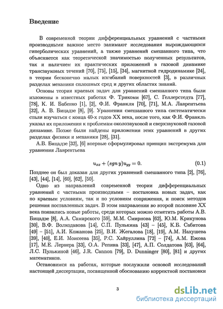 Начало исследований краевых задач для уравнений смешанного типа было положено в работах Ф. Трикоми и С. Геллерстедта. В дальнейшем основы теории уравнений смешанного типа были заложены в работах Ф.И. Франкля, К.И. Бабенко, М.А. Лаврентьева, А.В.Бицадзе, М.М. Смирнова, В.Ф. Волкодавова, СП. Пулькина, К.Б. Сабитова, А.И. Кожанова, В.И. Жегалова, A.M. Нахушева, Е.И. Моисеева, Р.С. Хайруллина, О.А. Репина, А.П. Солдатова и других математиков.