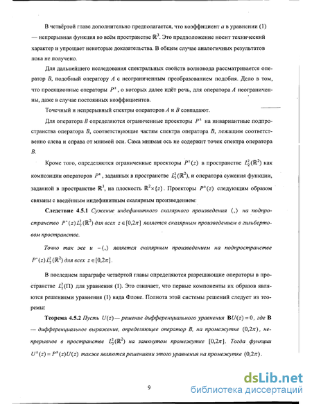 \lx Я0УФ(Н)<Ю = |ф(Н) div(/itf0) п п а также в областях Q^, получающихся сдвигом области Q вдоль оси z на 2лк, к є Z. Более того, любая функция F, принадлежащая пространству L\ ДО) векторных функций, квадратично суммируемых с весом є, единственным образом представима в виде суммы F - Fx+F2, где функция F, принадлежит замыканию в пространстве L\ Е (Q) множества {VeC;(Q):div(sV) = o}, a F2 — множеству {Vp:peZ2/oc(Q),VpeZ32(Q)}. Это доказывается также, как аналогичный результат для случая - = 0 в работе [1.15]. При этом попутно доказывается, что если F є W\ (Q), то F2 є W\ (Q). To же самое верно и для функций, заданных в областях П \ Q, где П = \(x,y,z)T :0 Таким образом, любое решение Е, Я системы уравнений (3) представимо в виде (9). Для решений Е и Я системы уравнений (1) выполняются равенства div(-) = 0, div(//tf) = 0. Следовательно, согласно формуле (8), функции Ф(Е) и Ф(Н) должны являться решениями уравнений сііу0гУФ(Е)) = 0, (Ііу(//УФ(н)) = 0. (11) Пусть теперь функции Ф(Е) и Ф(Н) являются классическими решениями уравнений (11). Построим по ним решение системы уравнений (3) вида (9). Для того чтобы векторные функции Е и Н в формуле (9) были решением системы уравнений (3), необходимо и достаточно, чтобы векторные функции Е0 и Н0 удовлетворяли условию: Jrot Е0 = -ісоцН0 - иу/УФ(н), [rot Н0 = ій)єЕ0 + ібоєЧФ{Е). Поделим первое уравнение системы (12) на функцию /л и применим к обеим частям rot.' Тогда, подставляя в правую часть выражения для rot Н0, полученное из второго уравнения системы (12), получим следующее выражение для векторной функции Е0: f\ Л — rot Е0 = -icoju [ій)єЕ0 + і соє УФ(Е) ]- ісо/л УФ(Н) => 1 1 ґ — }xrotE0 -со2{ієЕ0=а2рєУФІЕ)-ісорУФт. (13) Это можно сделать, так как Е,Н є W\ (Q) П W2 (П \ Q) , и, следовательно, 2 (Q) П W2 (П \ Q) Верно и обратное: если векторная функция Е0 является решением уравнения (11), то векторные функции Е0 и Н0 =-{ia>jj.yx хоїЕ0 -УФ(Н) удовлетворяют системе уравнений (12),. оо . Разрешимость уравнения (11) в пространстве W\ (Q) ел W\ (П \ Q) была изучена в работе [1.14]. Таким образом, по всякому решению уравнений (11) строится решение системы (3), причём составляющая (v 3. Уравнения рассматриваемого вида можно использовать при моделировании упорядо- ченных полупроводниковых структур на поверхности твёрдого тела. Такие задачи возникают в современных технологиях получения наноструктур . Более подробно эти задачи описаны в работах [1.16]-[1.17]. Характеристика работы по главам В первой главе исследуется разрешимость поставленной граничной задачи в классе функций вида Флоке, то есть представимых в виде и = e'izv, где Е,— комплексное число, а функция v 2тг - периодична по переменной z. Точки Е,, для которых существует решение поставленной задачи, образуют спектр волновода, причём он делится на непрерывную и дискретную составляющие. Дискретный спектр состоит из тех точек Е,, для которых функция v квадратично суммируема на полосе П = yx,y,z)T: 0 < z < 2л\, а непрерывный спектр — это замыкание множества точек Е,, для которых функция v ограничена, но не квадратично суммируема на полосе П. Доказан следующий результат. Теорема Спектр волновода является дискретным множеством точек, не сгущающихся на конечном расстоянии, а непрерывный спектр совпадает с множеством: {i/j + ik-.kel, jueR, \/j\< jb01a0 }u{v + ik:kєZ, vєR }. Эти результаты похожи на результаты, полученные в работах [2.1], [2.2] и [2.9] для другого уравнения. Изложенные здесь результаты опубликованы в работе [2.10]. Во второй главе вводится волноводный оператор А, действующий в пространстве L] (П), непре