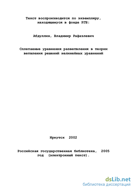 Абдуллин Владимир Рафаэлевич. Сплетаемые уравнения разветвления в теории ветвления решений нелинейных уравнений : диссертация ... кандидата физико-математических наук : 01.01.02.- Иркутск, 2002.- 73 с.: ил. РГБ ОД, 61 03-1/134-X