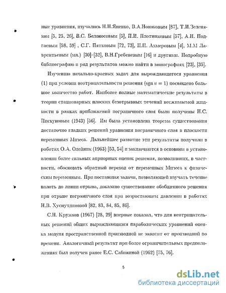 Изучению начально-краевых задач для вырождающегося уравнения (1) при условии неотрицательности решения (sgnu = 1) посвящено большое количество работ. Наиболее полные математические результаты в теории стационарных плоских безотрывных течении несжимаемой жидкости в рамках приближений пограничного слоя были получены Н.С. Ппскуновым (1943) [об]. Им была установлена теорема существования достаточно гладких решений уравнения пограничного слоя в плоскости переменных Мпзеса. Дальнейшее развитие эти результаты получили в работах О.А. Олепннк (19G3) [53, 54] и заключаются в основном в установлении более сильных априорных оценок решения, позволивших, в частности, обосновать обратный переход от переменных Мпзеса к физическим переменным. При постановке задачи, позволяющей изучать течение вплоть до линии отрыва, доказано существование обобщенного решения при отрыве пограничного слоя при возрастающем давлении в работах Н.В. Хуснутдпновой [82, 83, 84, 85, 86].