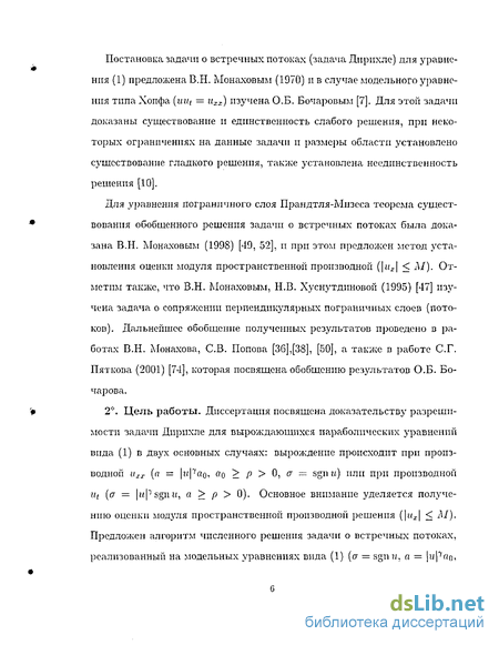 Для уравнения пограничного слоя Прандтля-Мнзеса теорема существования обобщенного решения задачи о встречных потоках была доказана В.Н. Монаховым (1998) [49, 52], и при этом предложен метод установления оценки модуля пространственной производной {\их\ < М). Отметим также, что В.Н. Монаховым, Н.В. Хуснутдиновой (1995) [47] изучена задача о сопряжении перпендикулярных пограничных слоев (потоков). Дальнейшее обобщение полученных результатов проведено в работах В.Н. Монахова, С.В. Попова [36],[38], [50], а также в работе С.Г. Пяткова (2001) [74], которая посвящена обобщению результатов О.Б. Бочарова.