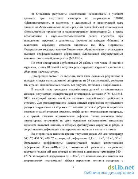 Отдельные результаты исследований использованы в учебном процессе при подготовке магистров по направлению 150700 «Машиностроение», и включены в лекционный и практический курс дисциплин «Математические методы решения задач объёмной штамповки» и «Компьютерные технологии в машиностроении», а также использованы в научно-исследовательской работе студентов, при выполнении курсовых и дипломных проектов на кафедре «Машины и технологии обработки металлов давлением им. И.А. Норицына» Федерального государственного бюджетного образовательного учреждении высшего профессионального образования «Московский государственный машиностроительный университет (МАМИ)».