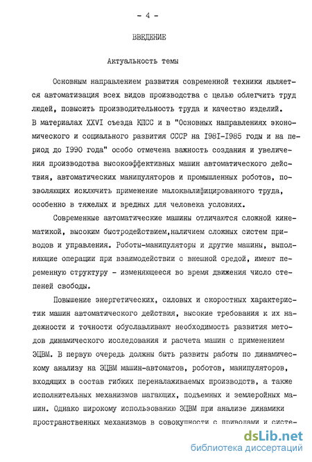 Повышение энергетических, силовых и скоростных характеристик машин автоматического действия, высокие требования к их надежности и точности обуславливают необходимость развития методов динамического исследования и расчета машин с применением ЭЦВМ. В первую очередь должны быть развиты работы по динамическому анализу на ЭЦВМ машин-автоматов, роботов, манипуляторов, входящих в состав гибких переналаживаемых производств, а также исполнительных механизмов шагающих, подъемных и землеройных машин. Однако широкому использованию ЭЦВМ при анализе динамики пространственных механизмов в совокупности с приводами и систе-