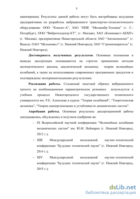 технологических машин, так и для развития принципиально новой отрасли вибротехники. Это дает возможность модернизировать машиностроительные предприятия, выпускающие вибрационное транспортно-технологическое оборудование, а также произвести техническое перевооружение действующих предприятий горнорудной, химической, стекольной и ряда других отраслей промышленности, использующих тонкодисперсные материалы и нанопорошки. Результаты данной работы могут быть востребованы ведущими предприятиями по разработке вибрационного транспортно-технологического оборудования: ЗАО “НПК “Механобр-Техника” (г. Санкт-Петербург), ООО “Вибротехцентр-КТ” (г.Москва), ЗАО “Консит-А” (г.Москва), предприятиями Нижегородской области ЗАО “Автокомпозит” (г. Выкса), ОАО “Мельинвест” (г. Нижний Новгород), ЗАО “Стромизмеритель” (г. Нижний Новгород).