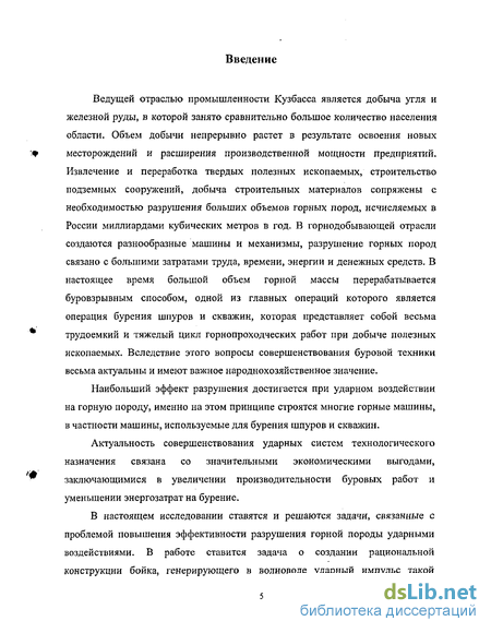 Ведущей отраслью промышленности Кузбасса является добыча угля и железной руды, в которой занято сравнительно большое количество населения области. Объем добычи непрерывно растет в результате освоения новых месторождений и расширения производственной мощности предприятий. Извлечение и переработка твердых полезных ископаемых, строительство подземных сооружений, добыча строительных материалов сопряжены с необходимостью разрушения больших объемов горных пород, исчисляемых в России миллиардами кубических метров в год. В горнодобывающей отрасли создаются разнообразные машины и механизмы, разрушение горных пород связано с большими затратами труда, времени, энергии и денежных средств. В настоящее время большой объем горной массы перерабатывается буровзрывным способом, одной из главных операций которого является операция бурения шпуров и скважин, которая представляет собой весьма трудоемкий и тяжелый цикл горнопроходческих работ при добыче полезных ископаемых. Вследствие этого вопросы совершенствования буровой техники весьма актуальны и имеют важное народнохозяйственное значение.