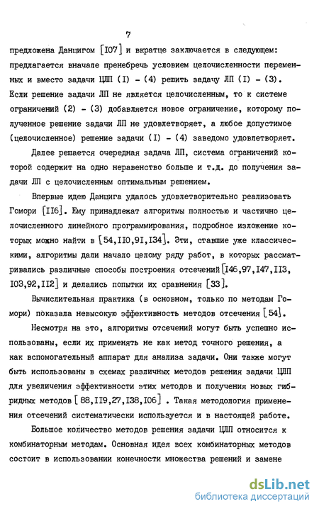 Впервые идею Данцига удалось удовлетворительно реализовать Гомори [Пб]. Ему принадлежат алгоритмы полностью и частично целочисленного линейного программирования, подробное изложение которых можно найти в [54,110,91,I34J. Эти, ставшие уже классическими, алгоритмы дали начало целому ряду работ, в которых рассматривались различные способы построения отсечений [146,97,147, ИЗ, 103,92,112] и делались попытки их сравнения [ЗЗ].