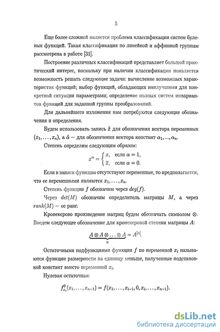 Каждая булева функция п переменных реализуется 23 ~2 различными полиномиальными представлениями Одним из критериев оценки этих представлений является их сложность Чем меньше сложность полинома, тем он предпочтительнее, так как меньшая сложность дает меньшие размеры и большую скорость работы электронных схем, построенных с использованием данного полинома Появление интереса непосредственно к полиномиальным представлениям булевых функций, как объектам исследования, связано с практическими приложениями после того, как в конце прошлого века в цифровой технике стали активно использоваться элементы типа "сложение по модулю 2" Тенденция развития электроники в направлении увеличения быстродействия, уменьшения энергоемкости и стоимости привела к необходимости повышения эффективности цифровой техники во время проектирования — на уровне представления схем булевыми функциями