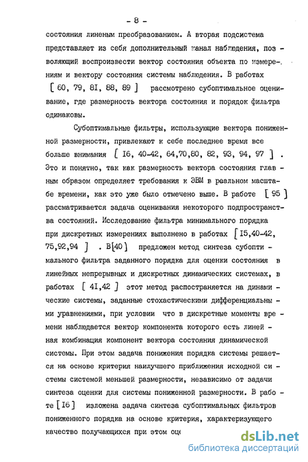 Субоптимальные фильтры, использующие вектора пониженной размерности, привлекают к себе последнее время все больше внимания ( 16, 40-42, 64,70,80, 82, 93, 94, 97 ] . Это и понятно, так как размерность вектора состояния глав -ным образом определяет требования к ЭВМ в реальном масштабе времени, как это уже было отмечено выше. В работе [ 95 } рассматривается задача оценивания некоторого подпространства состояний. Исследование фильтра минимального порядка при дискретных измерениях выполнено в работах [15,40-42, 75,92,94 J . В[40) предложен метод синтеза субопти -мального фильтра заданного порядка для оценки состояния в линейных непрерывных и дискретных динамических системах, в работах [ 41,42 ] этот метод распостраняется на динами -ческие системы, заданные стохастическими дифференциальны -ми уравнениями, при условии что в дискретные моменты вре -мени наблюдается вектор компонента которого есть линей -ная комбинация компонент вектора состояния динамической системы. При этом задача понижения порядка системы решается на основе критерия наилучшего приближения исходной си -стемы системой меньшей размерности, независимо от задачи синтеза оценки для системы пониженной размерности. В рабо -те [ 16 ] изложена задача синтеза субоптимальных фильтров пониженного порядка на основе критерия, характеризующего качество получающихся при этом оценок. В работах С 49, 73 - 9 -предложен субоптимальный алгоритм оценивания состояния и параметров нелинейных дтнамических систем.