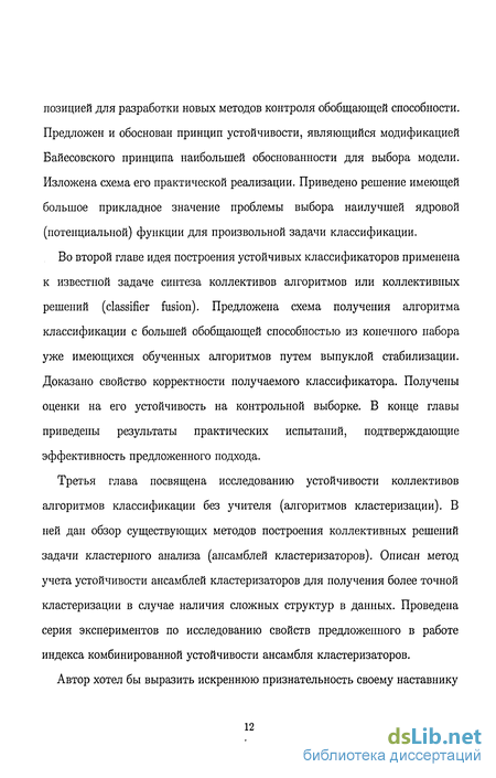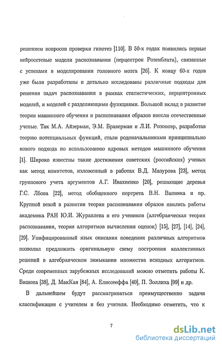 На протяжении последних 50 лет теория машинного обучения является одним из важнейших направлений прикладной математики и информатики. Она включает в себя разработку методов решения задач распознавания образов, восстановления регрессии, классификации, выделения кластеров, идентификации объектов, анализа изображений, нахождения скрытых закономерностей в данных и др. Необходимость в обучении ЭВМ возникает при отсутствии адекватных математических моделей исследуемой задачи. В основе теории лежит так называемый прецедентый подход к обучению. Предполагается, что имеется некоторая обучающая выборка признаковых описаний. Требуется извлечь из этих данных объективные закономерности и построить алгоритм, который будет использован (машиной или человеком) для принятия решений при обработке новых данных. Заметим, что задачи такого рода часто возникают в плохоформализованных областях таких как биология, социология, медицина, геология, химия. В последнее время методы машинного обучения находят применение также в таких областях знаний как экономика (особенно банковское дело, кредитование, анализ рынков ценных бумаг), физика. Методы data-mining, составляющие основу теории машинного обучения являются одними из наиболее активно используемых средств извлечения знаний в генной инженерии, лингвистике, анализе баз данных. Первые работы в области теории распознавания и классификации по прецедентам появились в 30-х годах прошлого столетия и были связаны с теорией принятия решений (работы Дж. Неймана, Е. Пирсона [88]), применением разделяющих функций к задаче классификации [51], решением вопросов проверки гипотез [110]. В 50-х годах появились первые нейросетевые модели распознавания (перцептрон Розенблата), связанные с успехами в моделировании головного мозга [26]. К концу 60-х годов уже были разработаны и детально исследованы различные подходы для решения задач распознавания в рамках статистических, перцептронных моделей, и моделей с разделяющими функциями. Большой вклад в развитие теории машинного обучения и распознавания образов внесли отечественные ученые. Так М.А. Айзерман, Э.М. Браверман и Л.И. Розоноэр, разработав теорию потенциальных функций, стали родоначальниками принципиально нового подхода по использованию ядровых методов машинного обучения [1]. Широко известны такие достижения советских (российских) ученых как метод комитетов, изложенный в работах В.Д. Мазурова [23], метод группового учета аргументов А.Г. Ивахненко [20], решающие деревья Г.С. Лбова [22], метод обобщенного портрета В.Н. Вапника и пр. Крупной вехой в развитии теории распознавания образов явились работы академика РАН Ю.И. Журавлева и его учеников (алгебраическая теория распознавания, теория алгоритмов вычисления оценок) [15], [27], [14], [24], [29]. Унифицированный язык описания поведения различных алгоритмов позволил предложить оригинальную схему построения коллективных решений в алгебраическом замыкании множества исходных алгоритмов. Среди современных зарубежных исследований можно отметить работы К. Бишопа [38], Д. МакКая [84], А. Елиссееффа [40], П. Золлиха [99] и др.