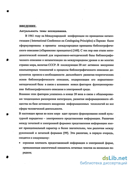В 1961 году на Международной конференции по принципам каталогизации (International Conference on Cataloguing Principles) в Париже были сформулированы <-, и приняты международные принципы библиографического описания («Парижские принципы») [160]: С тех пор они стали методологической основой для нормативно-методической базы библиографического описания и каталогизации на международном уровне и во многих странах мира, включая СССР. В последующие 20 лет активное внедрение компьютерных технологий в процессы библиографического описания документов; привело к необходимости дальнейшего развития теоретических основ библиографического описания; модернизации его нормативно-методической базы в связи с влиянием новых факторов функционирования библиографического описания в электронной среде. Влияние этих факторов усилилось в конце 20 века в связи с общемировыми тенденциями расширения интеграции, развития информационного общества на базе активного внедрения информационных технологий во все сферы человеческой деятельности.