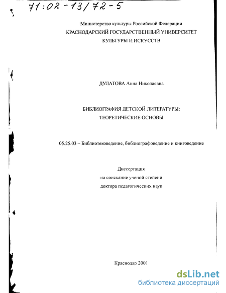 литературы, обоснованию расширения ее методологической базы, определению сущности и участия в передаче культурного опыта поколений. Рассмотрены проблемы круга детского чтения, моделирования системы знания школьника средствами библиографии; роль информационной культуры в формировании информационного мировоззрения. Проанализировано состояние понятийного аппарата в библиографии детской литературы, предложены рабочие определения основного термина и понятия. В третьей главе рассмотрена специфика библиографии детской литературы как области деятельности, ее статус в общей структуре библиографии, проявления феномена в ее объектах, в процессе библиографирования, показана необходимость переосмысления места исследуемой библиографии в видовой структуре библиографии в целом. В заключении подведены итоги исследования, намечены пути дальнейшего совершенствования теории библиографии детской литературы.