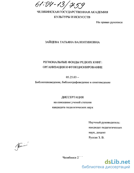 Апробация работы. Основные положения и выводы диссертации выносились на обсуждение на Уральском форуме «Культура, искусство и информатизация на рубеже третьего тысячелетия» (Челябинск, 1996), излагались на научных конференциях академии. С 1996 года автор возглавляет секцию «Фонды редких книг» в методическом объединении вузовских библиотек Челябинской области.
